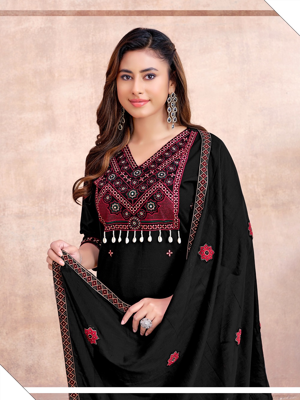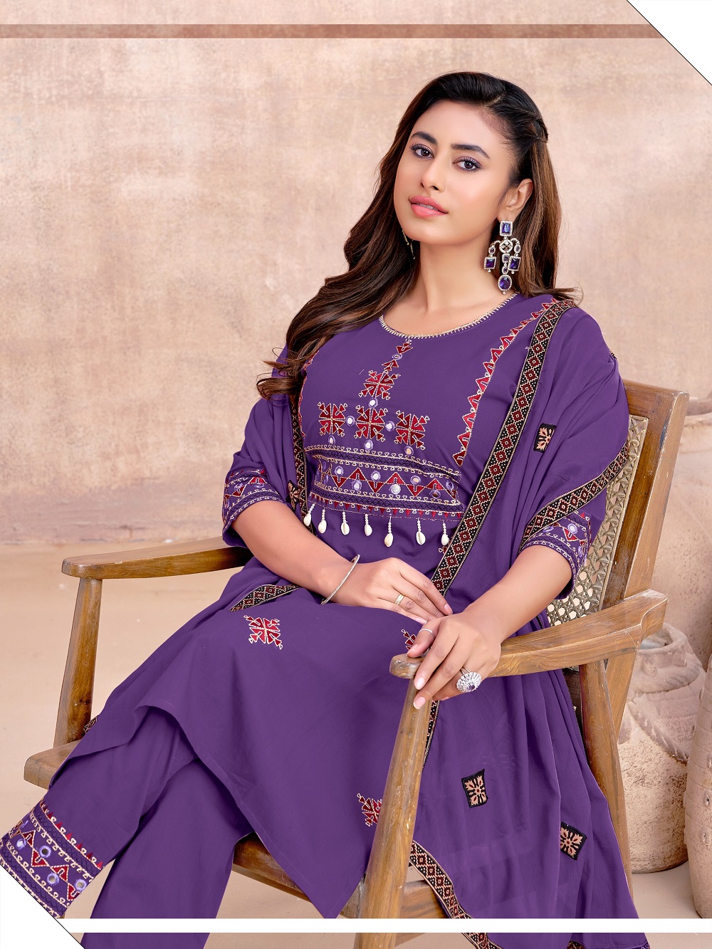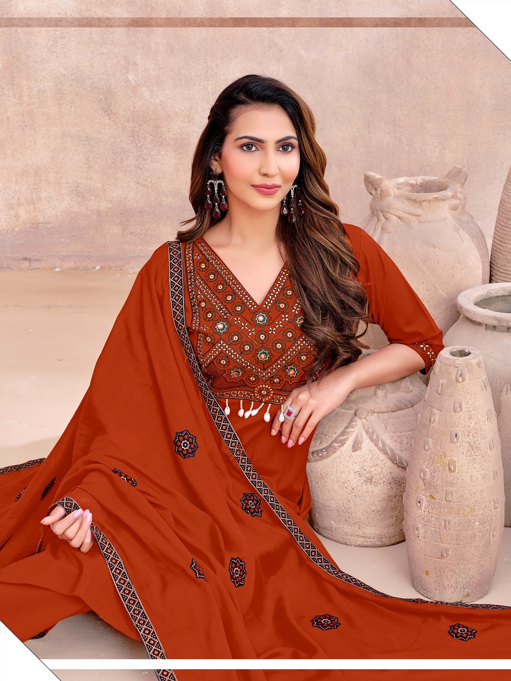 Rooted in centuries-old Ajrakh tradition, each piece is a textural expression of heritage—where classic geometric and floral motifs are meticulously translated into dense, artisanal embroidery, creating depth, richness, and quiet luxury