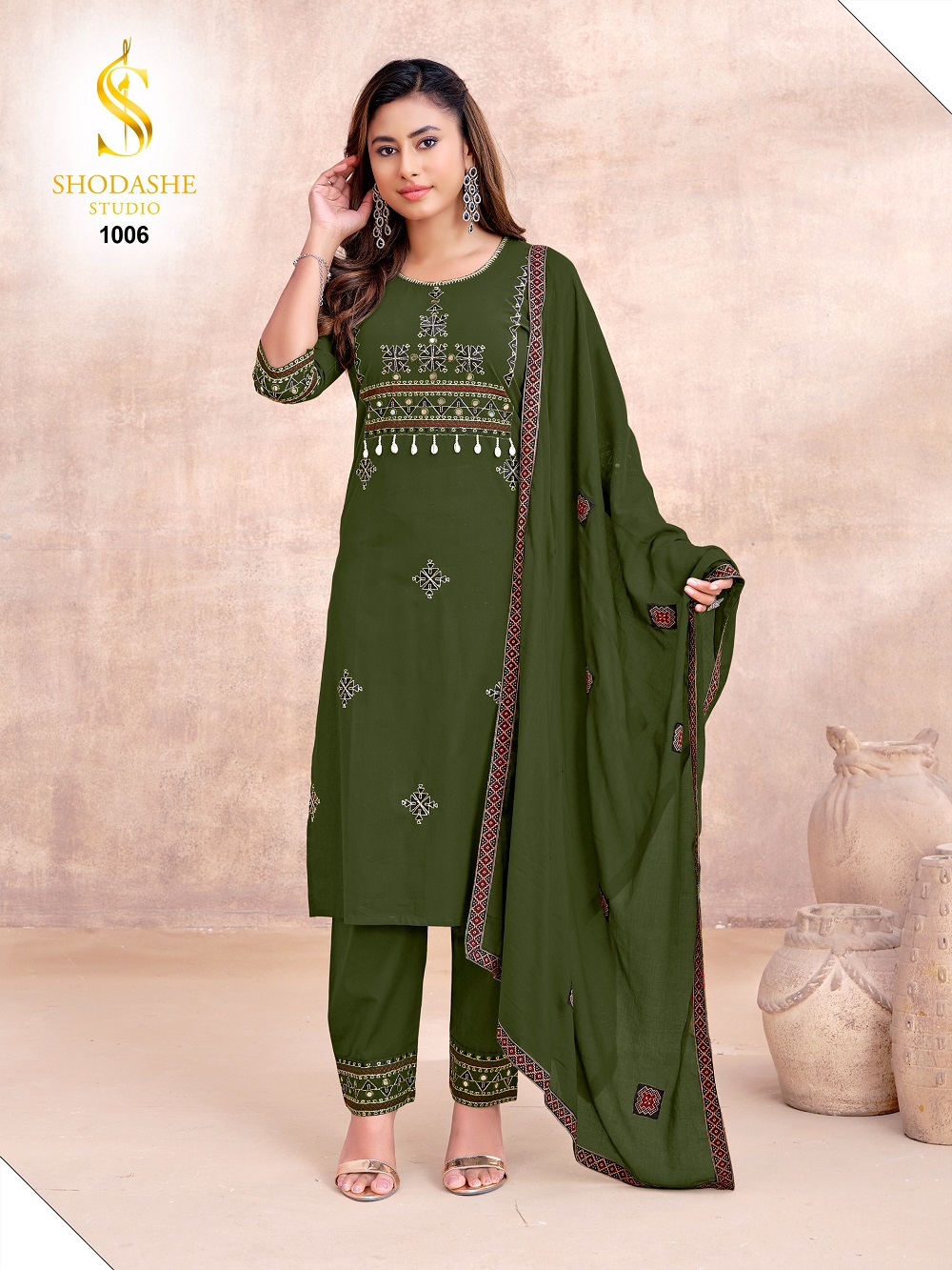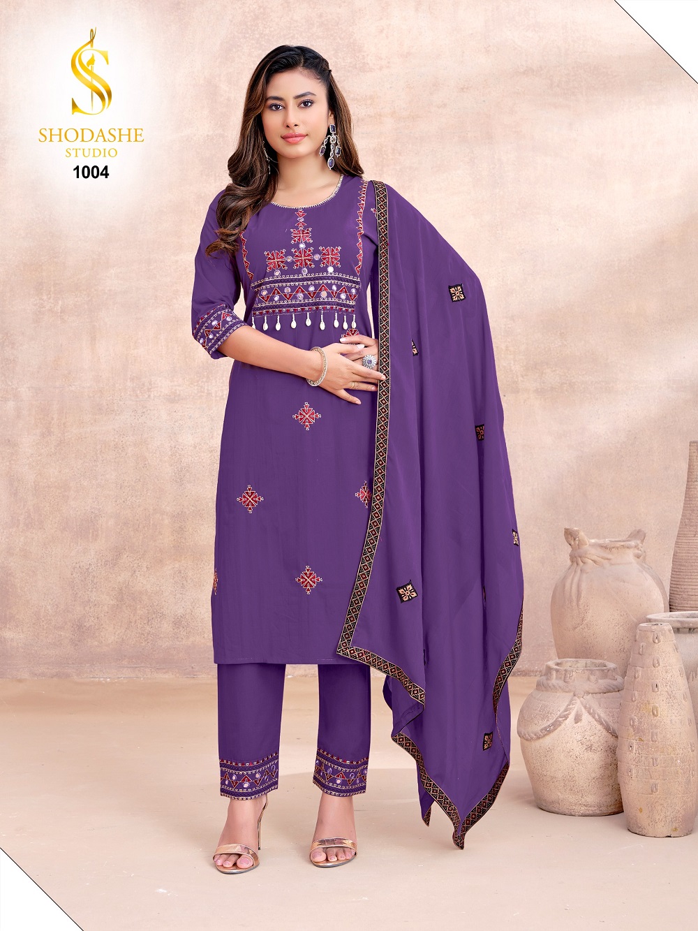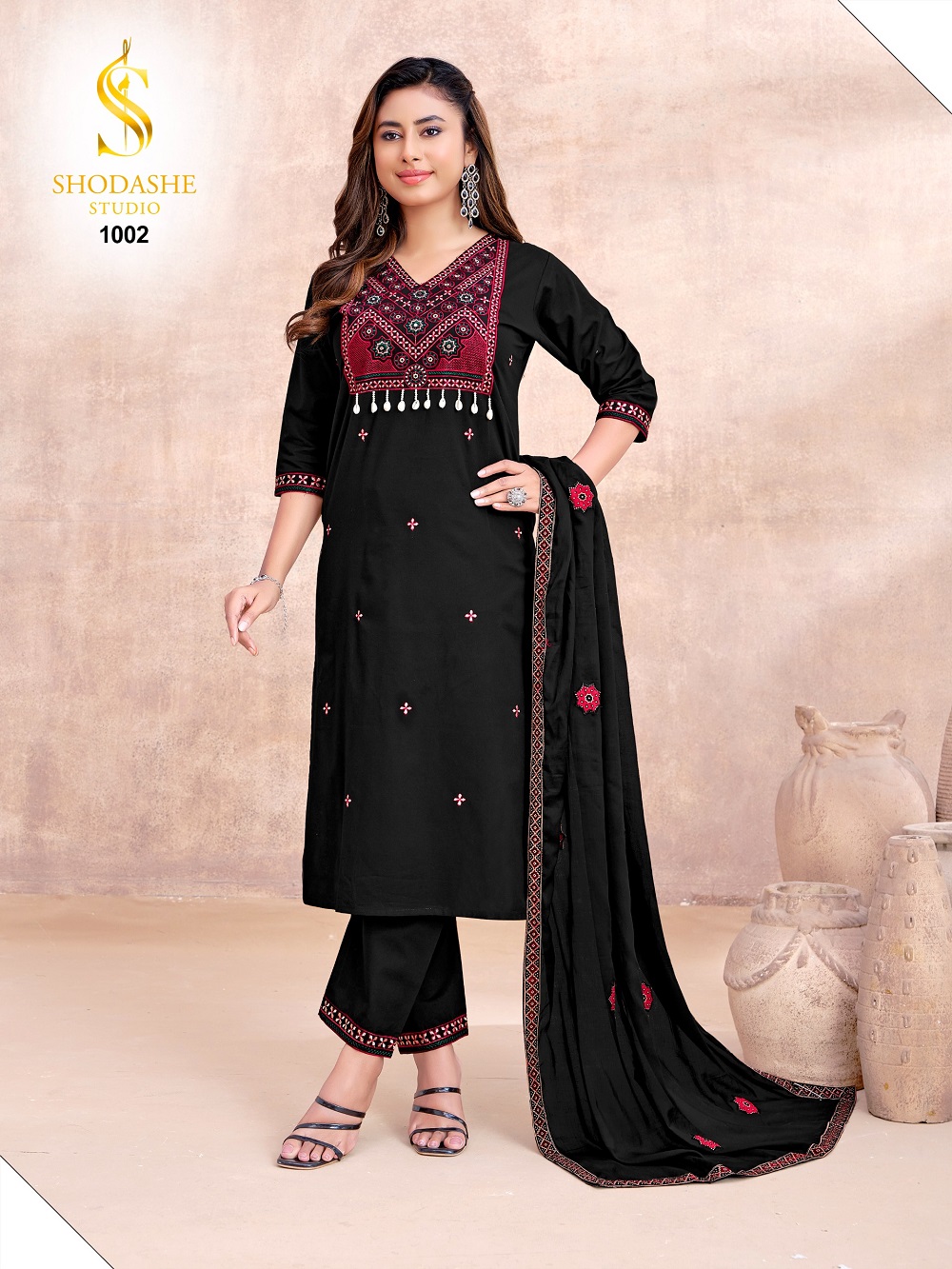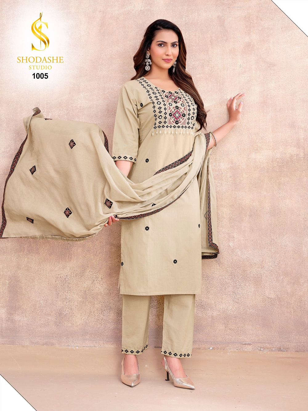 Rooted in centuries-old Ajrakh tradition, each piece is a textural expression of heritage—where classic geometric and floral motifs are meticulously translated into dense, artisanal embroidery, creating depth, richness, and quiet luxury